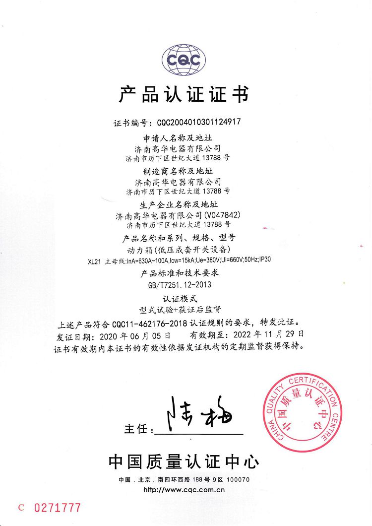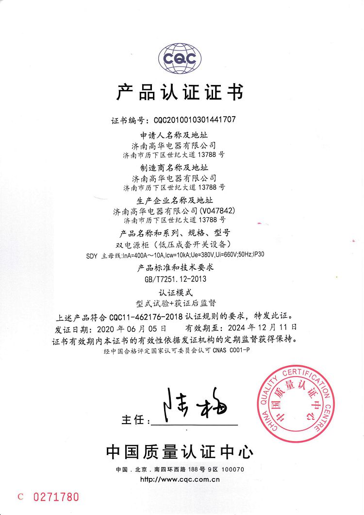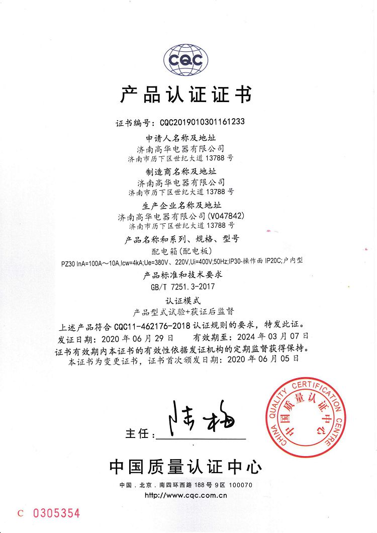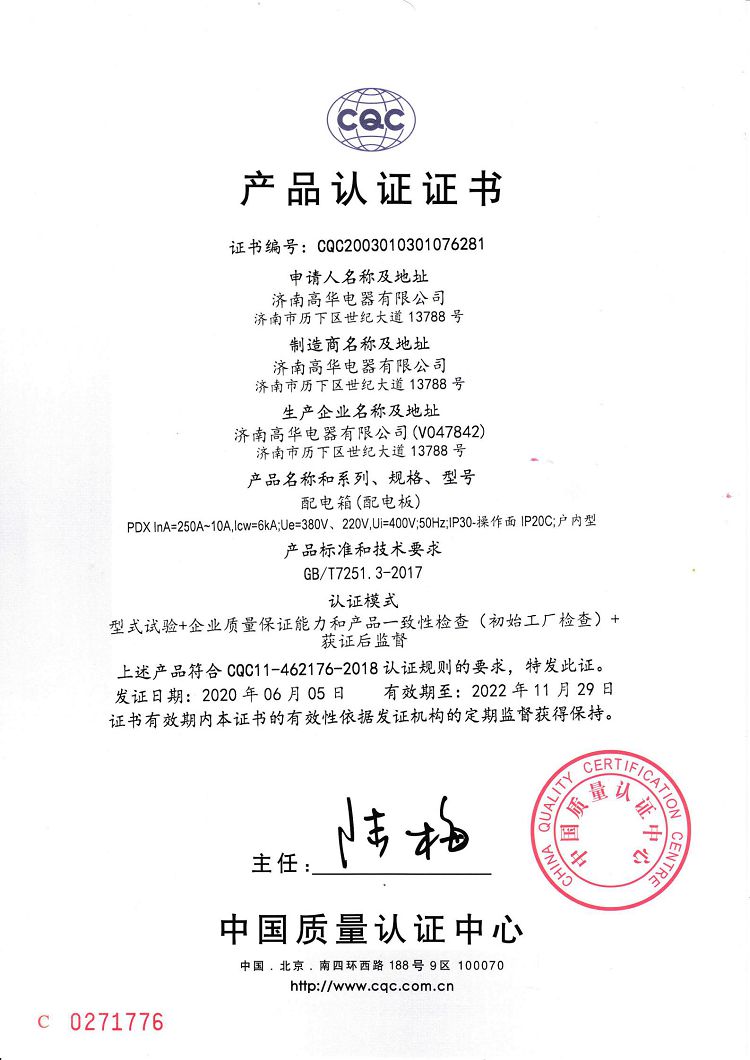 濟南高華電器有限公司 > 榮譽資質(zhì) > 2020CQC產(chǎn)品認證證書