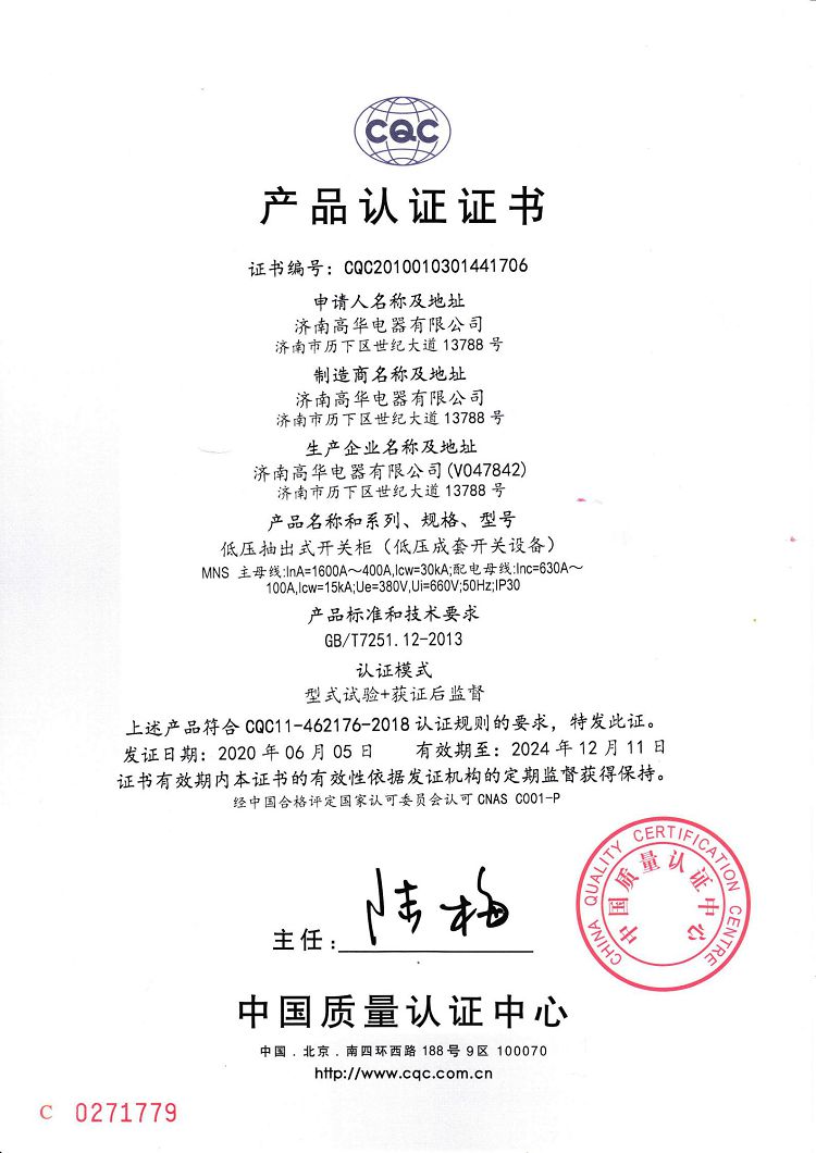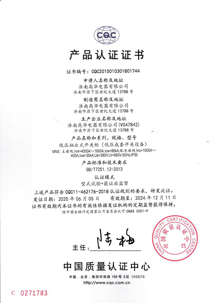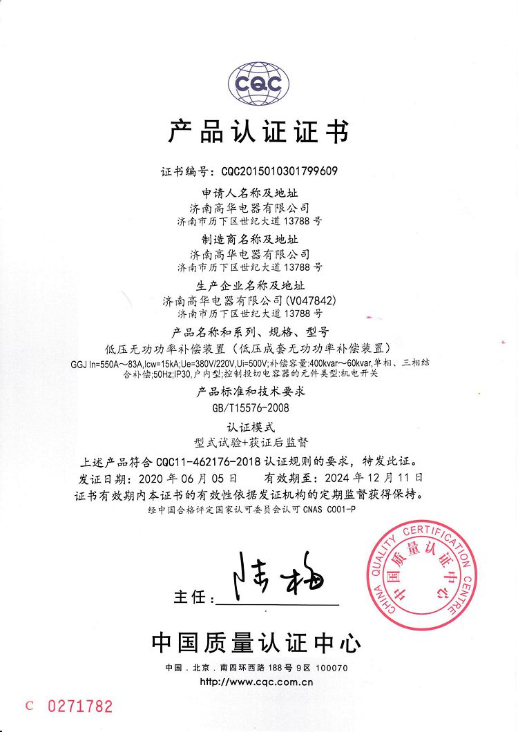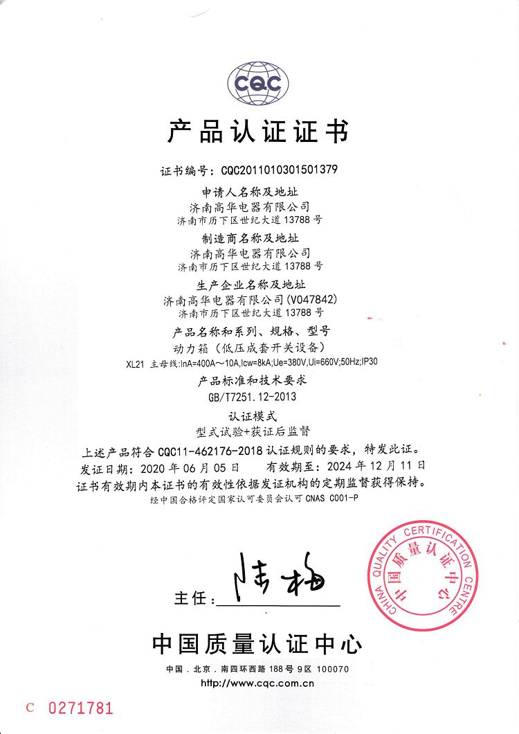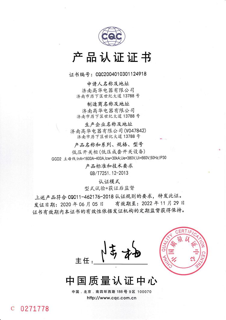 濟南高華電器有限公司 > 榮譽資質(zhì) > 2020CQC產(chǎn)品認證證書